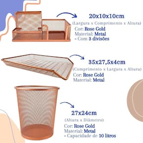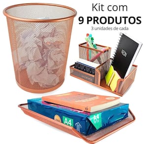 Kit completo de escritório com 9 produtos rose gold - cesto lixo, porta caneta organizador de mesa e bandeja organizadora para documentos