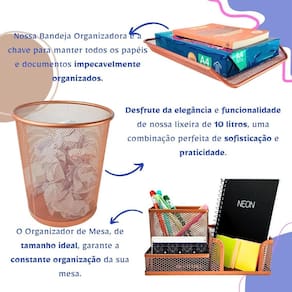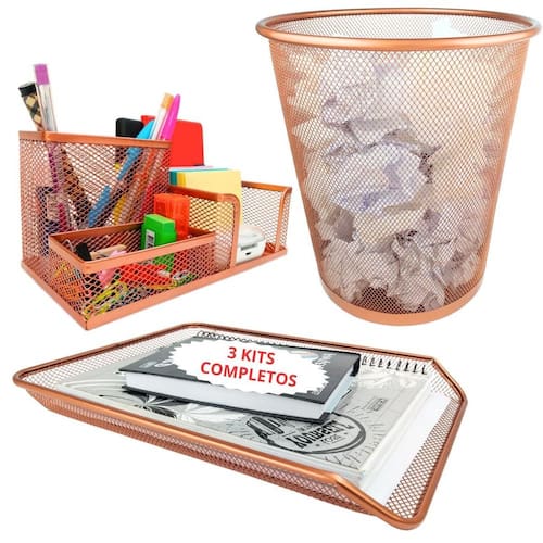 Kit organizadores de escritório composto por: - 03 lixeira aramada rose gold 10l - 03 bandeja organizadora simples rose gold - 03 organizador de mesa com 3 partições rose gold