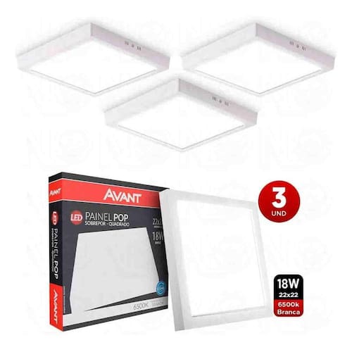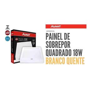 Painel Led Sobrepor Quadrado 18W 6500K Bivolt Branco Frio Avant 768101372A Mobilar Eletro está no mercado há mais de 25 anos inovando em produtos e atendimento estabelecendo uma relação de confiançaA linha de painel pop sobrepor é indicada para instalações diretamente sobre a caixa de passagem, em superfícies de alvenaria ou concreto.Compre agora mesmo com a Mobilar EletroCaracterísticas do produto:Temperatura ambiente: -5C a 40C.Tensão nominal: 100V a 240V.Fator de potência: 0,50.Baixo consumo de energia.Possui transformador eletrônico isolado.Fluxo luminoso constante em toda faixa de tensão.Tipo de instalação: Sobrepor.Corpo em alumínio e difusor em policarbonato.Especificações Técnicas:Potênca: 24WFluxo Luminoso: 1680lmEficiência Luminosa: 70lm/WÂngulo de abertura: 120Temperatura da cor: 6500KDimensões: 22x22Outras Informações Tensão Elétrica: 110/220V - Bivolt Índice de Proteção: IP20 Tipo do material: Alumínio e Policarbonato Fluxo Luminoso: 1260 lúmens Ângulo de Abertura: 120º IRC: 70 Baixo consumo de energia Vida Útil: 25 mil horasConteúdo da Embalagem:01 Painel Led Sobrepor.