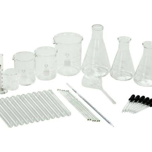 Kit de vidraria: 10 Copos de béquer 250 ml 10 Copos de béquer 600 ml 02 Frasco de erlenmeyer 250 ml 07 Provetas de vidros 100 ml 07 Pipetas graduadas 10 ml 50 Tubos de ensaio 16x150 mm 20 Tubos de ensaio 20x200 mm 20 Placas de Petri de 10x20 mm 10 Bastão de vidros 6x300 mm 20 Conta gotas de vidro com chupetas de borracha