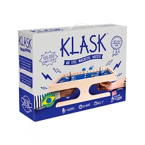Klask é um party game diferente, à primeira vista ele parece um air hockey misturado com futebol de mesa (totó ou pebolim dependendo da região), porém ele adiciona novas dinâmicas e alguns desafios extras como os fãs que além de atrapalhar ainda podem te fazer perder pontos. O tabuleiro é fácil de transportar e já vem pronto para jogar, sem precisar montar nem parafusar nada. Para ganhar você deve jogar a bolinha para o gol do adversário enquanto desvia dos fãs fanáticos que invadiram o campo.