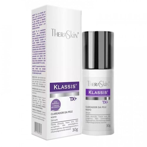 Klassis tx+ (ácido tranexâmico + complexo pró-Clareador) sérum clareador para a área do rosto, clareador da pele de rápida absorção, toque seco, não comedogênico, hipoalergênico, dermatologicamente e oftalmologicamente testado, klassis tx+ é um clareador para todos os tipos de pele que auxilia no clareamento e uniformização do tom da pele, reduzindo as alterações causadas pela idade, pelo efeito da exposição solar excessiva e por disfunções hormonais. Klassis tx+ foi especialmente formulado por dermatologistas visando o clareamento da pele de forma progressiva e multifuncional. O ácido tranexâmico associado ao inovador complexo pró-Clareador, promove um clareamento gradual e contínuo, deixando a pele iluminada e visivelmente mais uniforme. Klassis tx+ atua também na renovação celular e na proteção da microflora da pele promovendo ação sinérgica entre clareamento e cuidado da pele. Estudos clínicos demonstram a ação clareadora de klassis tx+ no rosto. Klassis tx+ apresenta textura leve e suave, oferece uma sensação refrescante ao toque, não gordurosa e de rápida absorção na pele. Principais ingredientes Tranexamic acid (ácido tranexâmico) Alpha-arbutin (alfa bisabolol) Niacinamide (vitamina b3) Orobanche (orobanchaceae) Rapum extract (extrato de rapum) Oligopeptide-34 (péptido) Modo de uso Aplicar diariamente pela manhã e à noite uma fina camada do produto sobre a pele limpa e seca ou conforme orientação médica. Recomenda-se uso concomitante de filtro solar. Uso externo. Antes de iniciar algum tratamento com dermocosméticos, consulte sempre o dermatologista. Ele é o profissional preparado para diagnosticar o seu problema e indicar o produto ideal para sua pele. Isento de registro conforme rdc 27/2010