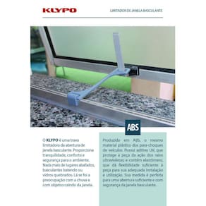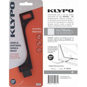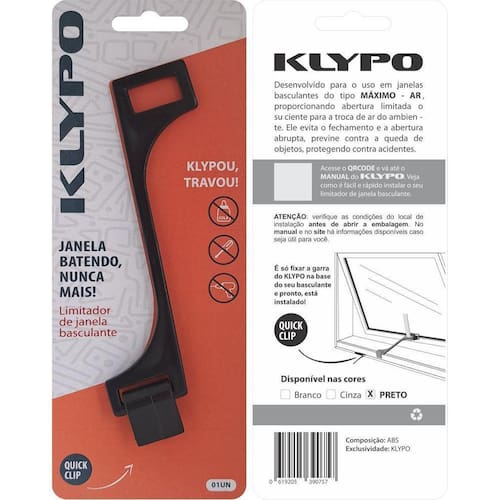 Desenvolvido para ser utilizado nas janelas basculantes do tipo máximo-ar, seja na sala, no banheiro, nas escadas, nos corredores de circulação, nas áreas comuns dos edifícios, em casa, no escritório, na empresa. Produzido em abs, o mesmo material plástico dos para-choques de veículos. Possui aditivo uv, que protege a peça da ação dos raios ultravioletas; e elastômero, que dá flexibilidade suficiente à peça para sua adequada instalação e utilização. O tamanho do klypo é medida única e perfeita para uma abertura suficiente e com segurança do basculante.