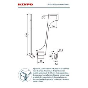 Assista o vídeo e veja como fazer: a garra do klypo é fixada sob pressão no perfil da base da janela basculante. A espessura do perfil mais a guarnição escova ou borracha deve ter medida aproximada de até 8 milímetros sob pressão . Essa medida alcança a grande maioria das janelas basculantes utilizadas nas edificações. Verifique antecipadamente a espessura da base de encaixe, a altura e a largura do fecho da sua janela.