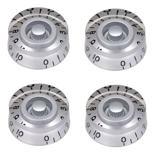 Os Knobs são botões de controle projetados para guitarra e baixo. Os knobs têm como função ajustar o tom e o volume de forma fácil e conveniente.Especificações:- Material: Plástico e Acrilico - Cor: Prata com números pretos - Diâmetro do controle interno: 6 mm- Diâmetro da parte inferior: 26 mm- Diâmetro da parte superior: 17 mm- Altura: 12 mm- Peso de cada peça: 19g - 4 PEÇAS
