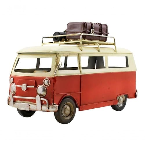 Kombi Vermelho Com Bagagens 25cm Estilo Retrô - Vintage Enfeite decorativo no formato de um kombi vermelho com 25 cm de comprimento no estilo retrô vintage. Produto exclusivamente com função decorativa. Material: metal