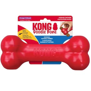 O brinquedo KONG Goodie Bone™ cativa os cães que adoram sessões de mastigação. Feito com a fórmula exclusiva de borracha vermelha natural KONG Classic, este osso conta com os patenteados Goodie Grippers™, que transformam este brinquedo divertido em um divertido desafio de distribuição de petiscos, que pode ser recheado com a ração favorita do seu cão. Quer prolongar a sessão de mastigação? Recheie com KONG Snacks™ e atraí-lo com um pouco de KONG Easy Treat™. • Borracha KONG natural durável; formato de osso para satisfação na mastigação • Os furos patenteados Goodie Gripper™ são ideais para desafios de enchimento • Dois Goodie Grippers™ estendem o desafio de ocupar a mente • Fabricado nos EUA. Materiais de origem global.