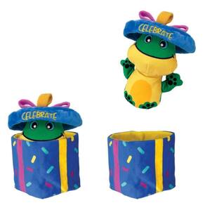 Um guincho na cabeça do pelúcia desperta o instinto natural de forrageamento de seu amigo, enquanto a base da caixa de presente enrugada incentiva seu amigo a continuar a diversão. Pata perfeita para um jogo interativo de arremesso, seu cão vai adorar extrair toda a surpresa do sapo de pelúcia. Este sapo macio torna o tempo de aconchego uma pata.