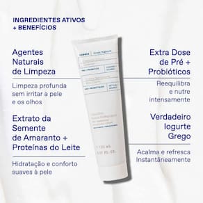 Korres Greek Yoghurt é livre de sabão em sua composição e conta com o verdadeiro iogurte grego, que acalma e hidrata a pele, inclusive as sensíveis e secas.