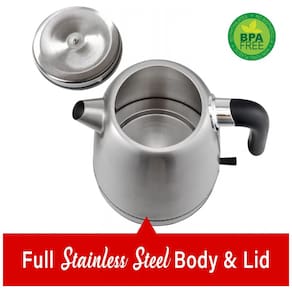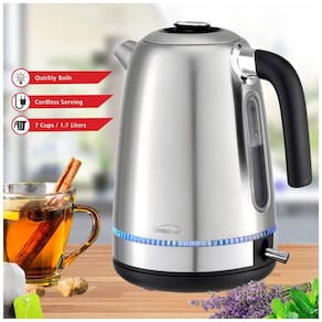 CAPACIDADE DE 1,7 LITRO Leva até 7 xícaras de água para ferver em apenas alguns minutos DESIGN SEM FIO Chaleira elétrica de bancada com um design sem fio conveniente AQUECIMENTO OCULTO Apresenta um elemento de aquecimento oculto e uma placa de aquecimento em aço inoxidável CARACTERÍSTICAS DE SEGURANÇA As funções de fervura seca e de desligamento automático evitam o superaquecimento BASE GIRATÓRIA A base giratória de 360 graus funciona independentemente de como a chaleira está colocada nela