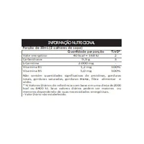 Água deionizada, L-carnitina, mix de vitaminas (pantotenato de cálcio (vitamina B5) e tiamina (vitamina B1)), espessante glicerina vegetal, acidulantes ácido cítrico e ácido málico, conservantes sorbato de potássio e benzoato de sódio e aromatizante. NÃO CONTÉM GLÚTEN.