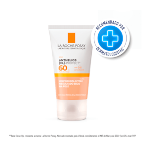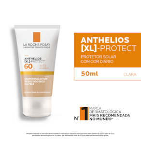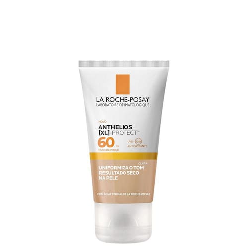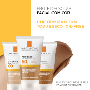 Protetor solar com cor para todos os tipos de pele. Com toque seco, Anthelios XL Protect FPS 60 uniformiza o tom e protege do envelhecimento precoce causado pela exposição solar.