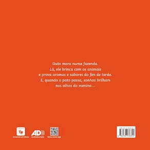 "Guto é um menino de 5 anos que mora com sua família em uma fazenda no sul do Brasil. Ele adora viver nesse lugar e todos os dias admira a vida e a natureza a seu redor: as galinhas botando ovos, as vacas produzindo leite, os passarinhos que voam alegres por todos os lados, as abelhas ziguezagueando entre flores de tantas cores... Mas do que será que Guto mais gosta na vida da fazenda?