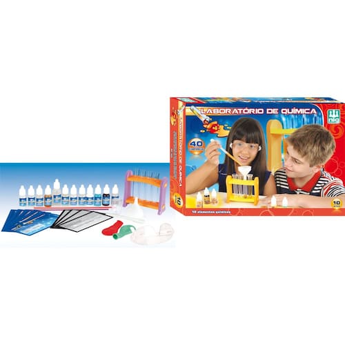 Super laboratório com experimentos químicos testados por professores e fenômenos que vão surpreender a todos. São 10 reagentes químicos para a criança conhecer e praticar 40 experiências, seguindo as fichas de instrução. O laboratório acompanha ainda quatro tubos de ensaio, uma pipeta, canudos, bexigas e estante de EVA para organizar o material. Ref. 1633 + 10 anos Plástico + reagentes + cartão 40 experiências 1 ou mais pessoas 43,0 x 30,0 x 6,0 cm Ean: 7896200716338