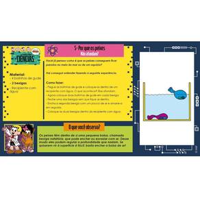 Conteúdo da Embalagem: 1 óculos de segurança, 1 lupa, 6 tintas guache, 1 pincel, 1 barquinho de EVA, 4 bexigas, 1 funil, 3 corantes alimentícios, massa de modelar, 1 régua de papel, 1 vareta plástica, kit bolhas de sabão, 1 pinça de plástico, 1 pipeta, 1 estante para tubo de ensaio, quadro impressão de digital, cartões impressos fases da lua , 1 copinho, 2 tubos de ensaio, cartões Bidu, cartões em branco, tabelas de artrópodes, arco-íris em cartão