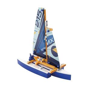 Reprodução fiel de um barco catamarã com várias peças que podem ser montadas e desmontadas facilmente.
