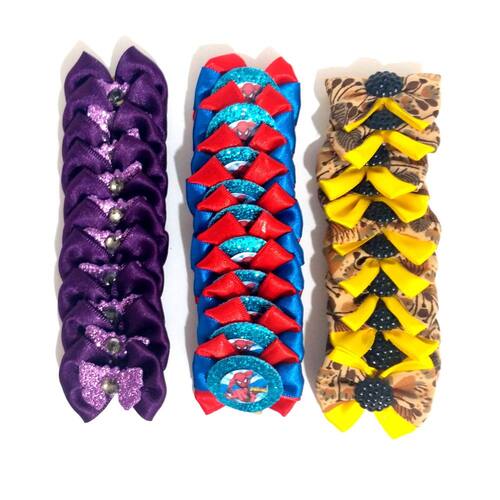 Este laço deixará seu pet ainda mais com estilo e elegância. Confeccionado em tecido estampado e com apliques diversos. Laço pequeno. Dimensões: Comprimento: 4cm Largura: 3cm Cores: 10 unidades na cor roxa; 10 unidades azul homem aranha; 10 unidades da cor laranja com marrom. Apresenta liga resistente de silicone na parte de trás para ser amarrado ao pelo. Kit acompanha 30 lacinhos conforme fotos. Marca: Não Informado Ean: 7438477809322