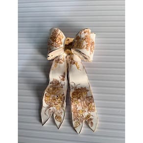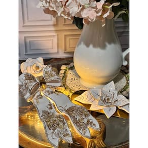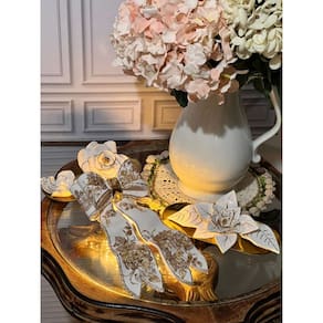 Com 17 cm de largura e 27 cm de comprimento, o laco possui um tamanho ideal para se destacar sem perder a delicadeza. O acabamento em ouro 24k valoriza ainda mais o desenho floral, trazendo brilho refinado e atemporal, perfeito para composicoes classicas ou modernas.