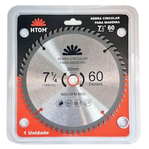 Lâmina de Serra Circular 185mm para Madeira 7-1/4 Pol com 60 Dentes HTOM Lâmina de Serra Circular 185mm para Madeira 7-1/4 Pol com 60 Dentes HTOM. Fabricada em aço temperado com dentes de metal duro. Acompanha anel para furo de 16mm. - Marca: HTOM - Referência: HTOM-40982 - Diâmetro da lâmina: 184mm 7-1/4 - Diâmetro do furo: 20mm - Acompanha anel para furo de 16mm - Espessura: 2,2mm - Número de dentes: 60 - Lâmina de qualidade - Fabricada em aço temperado com dentes de metal duro - Indicada para que procura uma lâmina com cortes precisos e excelente rendimento - Rotação máxima: 8.600 rpm - Serra em aço temperado - Dentes em metal duro - Maior rendimento - Cortes precisos - Utilize epi: óculos de segurança, proteção respiratório e luvas - : 90 dias contra defeitos de fabricação Marca: Não Informado Ean: 7898452031139