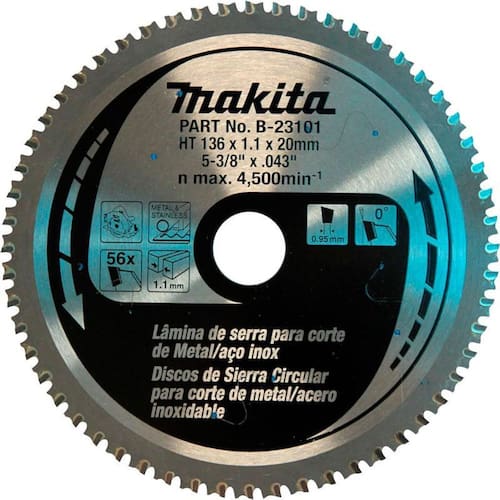 Lamina De Serra Tct 136mm X 20mm X 56t Makita B-23101 Metal CARACTERÍSTICAS: Disco com baixa espessura, promove corte rápido com ótimo acabamento e consome menos energia da bateria da serra.