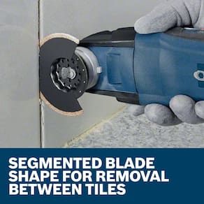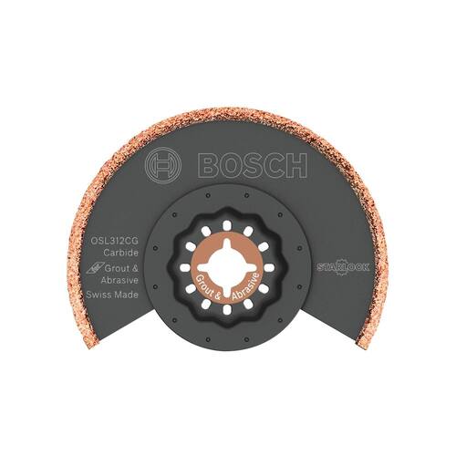 BOSCH OSL312CG 1 peça 3-1/2 pol. x 1/20.3 cm. Lâmina de rejunte multiferramenta oscilante Starlock e grão de carboneto abrasivo para aplicações na remoção de argamassa - Os acessórios StarlockMax são compatíveis apenas com ferramentas StarlockMax - Revestimento de grão de carboneto premium para longa vida útil em aplicações de argamassa e azulejos - Forma de lâmina segmentada para remoção entre azulejos - Interface codificada por cores e lâmina gravada a laser para identificar rapidamente a lâmina certa - Interface Starlock para desempenho profissional, também funciona com ferramentas compatíveis com OIS, incluindo Bosch, Fein, Milwaukee, Makita, Rigid, outras - Lâmina de precisão feita na Suíça