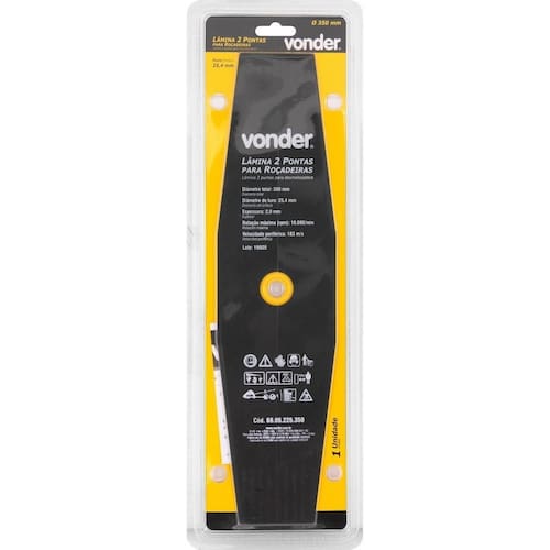 Diâmetro total da lâmina para roçadeira: 350,0 mm Diâmetro do furo da lâmina para roçadeira: 25,4 mm Número de pontas/dentes da lâmina para roçadeira: 2 pontas Largura da lâmina para roçadeiras: 90 mm Rotação máxima rpm : 10000 /min