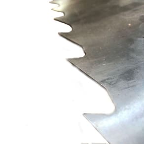 EMENDA SOLDA MIG, LAMINAÇÃO, AFIAÇÃOFabricada em aço Carbono 1075 temperado.Emenda da lâmina em processo exclusivo de solda MIG (Metal/Gás Inerte) com área revenida em temperatura controlada.A Lâmina é laminada em cilindro de pressão para melhorar o apoio no volante da máquina. Dentes com distância padrão passo de 45 mm.Quando adquirida na forma PRONTA PARA USO os dentes da lâmina são emparelhados, recalcados, igualizados e afiados