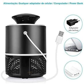 Cobertura de 360°: ele possui 4 leds uv que ilumina em 360°, atraindo os mosquitos de todos os cantos do ambiente. Cor violeta: seu led envia uma onda de luz violeta/neon de 365nm, projetada para aumentar a atratividade aos mosquitos. Cooler: possui um ventilador embutido que faz a sucção dos mosquitos em 360° para dentro da armadilha, onde morrem por desidratação. Alimentação via usb: poderá liga-lo diretamente em uma porta usb de seu computador ou power bank bateria portátil . Não acompanha adaptador para tomadas. Baixo nível de ruído: o mata mosquito possui a tecnologia denoise, que reduz os ruídos da ventoinha do produto a apenas 35db uma fala normal alcança 60db . Fácil de limpar: basta girar a parte de baixo para abrir o mata mosquito e fazer a limpeza do reservatório da forma que preferir. Bebês e crianças: seu som baixo e contínuo ajuda a prolongar o sono dos bebês e crianças pequenas, assim como o som contínuo de um ar condicionado ajuda muitos adultos. Sem cheiro: ao contrário dos mata mosquitos elétricos que ao grudar ficam "fritando" e soltando cheiro de queimado, este não solta nenhum cheiro Aparelho mata mosquito - ambientes fechados Alimentação via cabo usb, fonte não inclusa