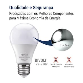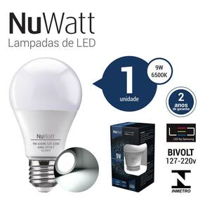 A NuWatt inova ao trazer ao mercado brasileiro a melhor tecnologia em lâmpadas de LED. As lâmpadas NuWatt proporcionam a você inúmeras vantagens, que vão desde a sua durabilidade de 25.000 horas, economia de energia e excelência na qualidade, garantida pela tecnologia Samsung LED. Além disso, as lâmpadas não emitem raios U.V e I.R. e contam com toda a segurança da certificação pelo INMETRO. De fácil instalação e sem manutenção, agora você pode contar com a melhor solução em iluminação com tecnologia Samsung aí na sua casa! A NuWatt Tem: • 2 ANOS DE GARANTIA (uma das maiores garantias do mercado)• DURABILIDADE DE 25.000 HORAS• TECNOLOGIA SAMSUNG LED INSIDE• CERTIFICADO INMETRO Informações técnicas: Tensão da rede: 127-220 VPotência: 9 WFluxo Luminoso: 810 lmEficiência Energética: 90 lm/WTemperatura da Cor: 6.500 KÍndice de Reprodução de Cor: 80 RaVida Média: 25.000 hFrequência: 60 HzCorrente: 74 mA [127 V] | 46 mA [220 V]Fator de Potência: >0,70Base: E27Potência Equivalente Incandescente: 60 WPotência Equivalente Fluorescente: 16 WDimensões: 60 mm [D] x 110 mm [C]Peso: 43 g Marca: NUWATT