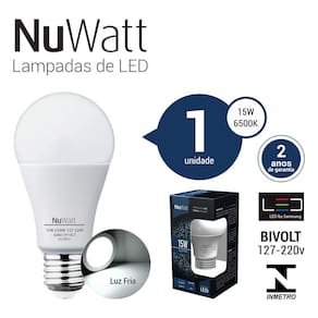 A NuWatt inova ao trazer ao mercado brasileiro a melhor tecnologia em lâmpadas de LED. As lâmpadas NuWatt proporcionam a você inúmeras vantagens, que vão desde a sua durabilidade de 25.000 horas, economia de energia e excelência na qualidade, garantida pela tecnologia Samsung LED. Além disso, as lâmpadas não emitem raios U.V e I.R. e contam com toda a segurança da certificação pelo INMETRO.  De fácil instalação e sem manutenção, agora você pode contar com a melhor solução em iluminação com tecnologia Samsung aí na sua casa! A NuWatt Tem: • 2 ANOS DE GARANTIA (uma das maiores garantias do mercado)• DURABILIDADE DE 25.000 HORAS• TECNOLOGIA SAMSUNG LED INSIDE• CERTIFICADO INMETRO Informações técnicas: Tensão da rede: 127-220 VPotência: 15 WFluxo Luminoso: 1350 lmEficiência Energética: 90 lm/WTemperatura da Cor: 6.500 KÍndice de Reprodução de Cor: 80 RaVida Média: 25.000 hFrequência: 60 HzCorrente: 120 mA [127 V] | 71 mA [220 V]Fator de Potência: >0,70Base: E27Potência Equivalente Incandescente: 90 WPotência Equivalente Fluorescente: 26 WDimensões: 70 mm [D] x 134 mm [C]Peso: 84 g