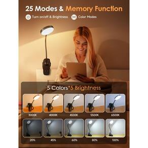 - ?5 modos com 5 brilhos reguláveis?A luz de leitura sensível ao toque tem 5 cores, pode ser ajustável de 3000 K a 6500 K (branco quente-natural-frio). Cada modo de iluminação tem 5 níveis de brilho para atender às suas diferentes necessidades. Lâmpada de fixação para cabeceira ou mesa-de-cabeceira, a luminária de mesa de LED com grampo será ideal para ler antes de dormir, luz confortável e conveniente para você Comfort.U pode usar o clipe regulável na luz de leitura sensível ao toque como uma lâmpada de estudo ou use a luz de leitura como uma lâmpada de mesa