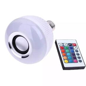Lâmpada Controle Musical De Led Caixa De Som Bluetooth Lâmpada bulbo 12w de potência que toca música e ainda tem controle remoto com 24 funções. Ela pode reproduzir músicas do seu celular, ou de qualquer outro dispositivo, que tenha bluetooth, com alta qualidade de som. Possui luz com ótima intensidade, além de 4 modos para operar as luzes. Características: - Cor: Rgb - Lâmpada bluetooth com controle remoto - Bocal: E27 é o bocal comum que temos em casa. - Lâmpada possui a capacidade de receber áudio via bluetooth. Assim você consegue reproduzir suas músicas e controlar as luzes por um controle remoto que já vai incluso. - Voltagem: AC 100-240V / 50-60 Hz - Potência: 12w - Potência do led: 7w - Potência do som: 3w - Frequência de resposta: 135Hz para 15KHz - Wireless: 3.0 - Distância de funcionamento: 10m Conteúdo da embalagem: - 01 Lâmpada bulbo rgb com bluetooth - 01 Controle remoto com 24 funções Dimensões aproximadas da lâmpada: - Circunferência aproximada: 30cm Homologação Anatel: 118782214976 Ean: 7894542358049