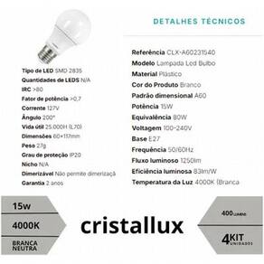 Lampada Cristallux Led Bulbo - 15w 6500k A melhor forma de iluminar qualquer ambiente com máxima economia. As lâmpadas de 16W são ideais para iluminação de áreas internas e externas. Com certificação do INMETRO. Por sua alta potência são indicadas principalmente para áreas com pé direito altos como galpões e quadras poliesportivas fechadas. A lâmpada LED economiza até 90% de energia elétrica quando comparada às lâmpadas incandescentes.