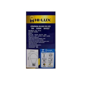 base : e27 tensão : bivolt automático 100v - 240v ângulo de abertura : 180 graus potência : 9w fluxo luminoso : 810 lumens temperatura de cor : 6500k emissão de cor : branca equivalência : incandescente 60w / fluorescente 16w dimensões : 108mm x 60mm Marca: Hi-Lux