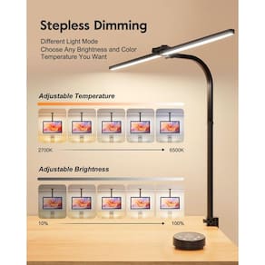 Ajustes suaves e infinitos: aproveite a melhor experiência de iluminação com nossa faixa de escurecimento infinita, permitindo que você ajuste o brilho de 10% a 100% com precisão. Além disso, nosso produto oferece uma ampla faixa de temperatura de cor de 3000K a 6500K, perfeita para qualquer clima ou ocasião. - Ajustes suaves e infinitos: aproveite a melhor experiência de iluminação com nossa faixa de escurecimento infinita, permitindo que você ajuste o brilho de 10% a 100% com precisão. Além disso, nosso produto oferece uma ampla faixa de temperatura de cor de 3000K a 6500K, perfeita para qualquer clima ou ocasião. - Controle remoto avançado: experimente a máxima conveniência e controle com o controle remoto inteligente sem fio de 10 m da nossa lâmpada de mesa LED de cabeça dupla. Ajuste facilmente a iluminação de qualquer lugar da sala, criando o ambiente perfeito com facilidade. A função de memória restaurará sua última configuração. - Proteção ocular e ultrabrilhante: confie em nosso alto índice de reprodução de cores (CRI) de 95 para fornecer verdadeira fidelidade de cores e clareza visual excepcional. Nosso produto também apresenta tecnologia inovadora de proteção ocular, reduzindo o cansaço visual e criando um ambiente de iluminação confortável e relaxante. - Design inovador: nosso sensor de proximidade de 5 polegadas permite que você acenda ou apague as luzes com um simples toque de mão para dar um toque de sofisticação moderna. Além disso, desfrute de um controle contínuo sem a necessidade de interruptores ou botões físicos. - Opções de montagem versáteis: Nosso produto oferece opções de montagem flexíveis e versáteis, permitindo que você instale e ajuste a direção e o ângulo da iluminação com facilidade. Inspirado nas pás dos ventiladores dos drones, nosso design elegante e moderno garante estabilidade e apelo estético.