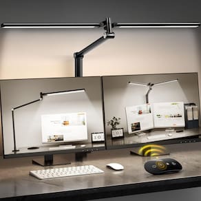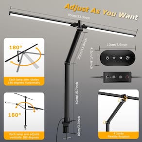 - Modelos ultra amplos de braços duplos e ajuste: nossas lâmpadas de mesa para escritório em casa possuem dois braços extra-largos, cada um com 44,5 cm de comprimento, com barras de luz que se estendem até 89 cm, oferecendo cobertura uniforme para uma mesa de 190 cm de largura e iluminação ampla e suave. Acomoda alturas de trabalho acima de 78,7 cm e é compatível com 76,2 cm, 73,7 cm, 68,6 cm, 61 cm e outros monitores. Lâmpada de mesa de escritório com fácil instalação e o design de estrutura de metal resistente se prende facilmente à borda da mesa em até 9 cm, liberando mais espaço na mesa