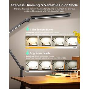 - [Vários efeitos de iluminação]: a luz de mesa LED com braços oscilantes possui função de escurecimento contínuo que permite ajustar livremente diferentes brilhos de 10% a 100% e faixa de temperatura de cor de 3000K a 5700K, alternando a cor da iluminação de branco quente, branco natural para branco frio para atender às suas necessidades de iluminação, ideal para fornecer iluminação clara e confortável para sala de estudo, sala de estar, quarto, escritório, oficina, oficina e muito mais