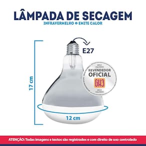 Especificações: Marca: GH3 Modelo: Lâmpada de secagem Base E27 Potência: 250W Cor da luz: 2700K branco quente Voltagem: escolha a voltagem desejada no botão do anúncio Vida útil média: 6000h. Composição: vidro e alumínio Tamanho: 17x 12 cm alt x diâmetro Peso: 91g