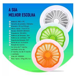 Mantém o ambiente fresco e confortável durante os dias quentes; Reduz a dependência de aparelhos de ar condicionado, economizando energia; Melhora a circulação do ar e a qualidade do ambiente interno; Adiciona um toque de elegância à decoração do espaço. Tipo de item: Ventilador de Teto Led com Controle Remoto Aroma terapia Material: ABS + PC Tamanho do produto: Diâmetro : Aproximadamente. 25 cm/9,8 pol, Altura: Aprox. 11cm/4.7in Tensão: 85-265V BIVOLT Frequência: 50/60Hz Potência da lâmpada: 30W Potência do ventilador: 4W Especificações do suporte da lâmpada: E27 Fonte de luz: luz branca Posição da marcha: luz única de 1 marcha, ventilador único de 2 marcha, luz de 3 marcha + ventilador Vida útil: 30000H Peso: Aprox. 576g/20,3 oz