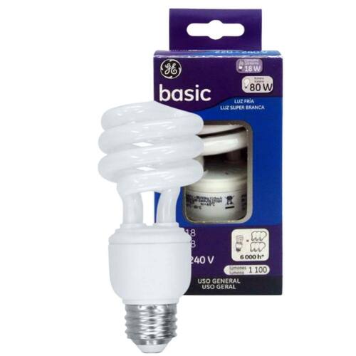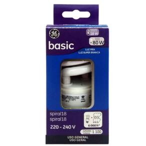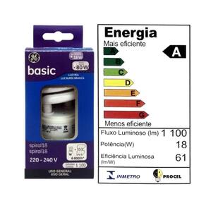 Descrição:As lâmpadas fluorescentes compactas integradas da GE oferecem benefícios de economia de energia e a alta qualidade em iluminação. Essas lâmpadas são alternativas perfeitas para substituir as incandescentes.Benefícios:- Acendimento imediato;- Economia de 80% em energia em comparação com as incandescentes e produtos rotulados "A" na tabela de energia;- Extraordinária qualidade de luz garantida durante a vida da lâmpada.Potência:18 watts.Tensão:220 volts.Base:E27.Fluxo luminoso:820 lm.Temperatura de cor:6500K / Branco Frio.IRC:80.Vida mediana:6000h.Bulbo:Espiral T3.Código: 56707Marca: GE