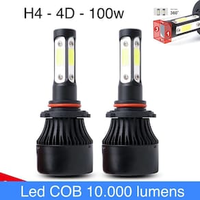 Modelo encaixe: H4 Potência: 100w par Fluxo luminoso: 10.000 lumens Tensão: 12 ~ 24 volts Ângulo de luz: 360 graus Qtd de Leds: 4 tipo de chip: COB Cor de luz: 6000k branca Cooler: sim Índice de proteção: IP68 a prova d água Material corpo: alumínio