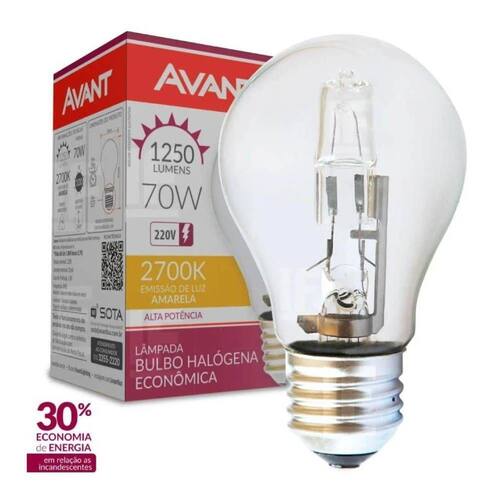 Potência 70w Luz Amarela 2700k, 30% de economia de energia em relação as lâmpadas incandecentes Temperatura ambiente: -5C a 40C Tensão de entrada: 220V Fator de potência:>0,50 Marca Avant Tipo de luz Halogênio Potência 70 watts Base da lâmpada E27 Cor clara Amarela