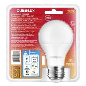 Ficha Técnica: - Potência: 9 Watts - Temperatura de Cor: 6.500k / 1.600k - IRC:>80 - Eficiência: 90LM/W - Facho: 220 - Base: E27 - Fluxo Luz (lm):810 - Lâmpada Fluorescente Equivalente (W):16 - Lâmpada Incandescente Equivalente (W)60 - Lâmpada Halógena Equivalente (W):50 - Eficiência (lm/W):100 - Temperatura de Cor (K)6500 (Branca Fria) / 1900 (Anti-inseto) - IRC mínimo:80 - Feixe (Graus):220 - Vida (horas):25000 - Dimerização:Não compatível - Temperatura Ambiente de operação (C):-10 C a 40 C - Grau de Proteção:IP20 - Certificação:INMETRO