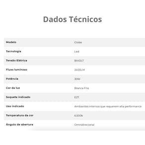 Escolha a qualidade e a inovação com a Lâmpada LED Globe 30W 6500K Branca Fria da Kian. Ilumine seus ambientes de forma inteligente, criando uma atmosfera convidativa e econômica!