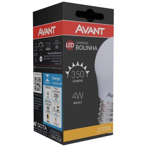 Lâmpada Led Bolinha 4w 2700k Amarelo 2700k Lâmpada Led Bolinha 4W 2700K Amarelo 2700K - AVANT A linha de lâmpadas LED Bolinha é indicada para iluminação decorativa. Pode ser usada para substituir lâmpadas incandescentes de 40W ou compactas de 12W. Uso em ambientes internos, iluminação decorativa residencial e comercial.