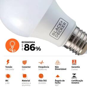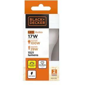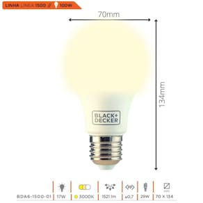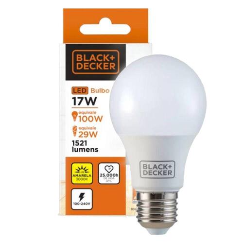 Lampada Led Bulbo A60 17W 3000K BLACK+DECKERCom a alta performance de um produto que precisa de constante utilização, a BLACK+DECKER™ traz ao mercado a lâmpada Bulbo LED com a qualidade e garantia que o consumidor já conhece em nossos produtos.Alta economia e durabilidade de até 25.000 horas.BDA6-1500-01Potência: 17 WTensão: 100-240VFrequência: 50/60 HzCorrente: 115/70 mAFator de Potência: = 0,7Conector: E27Temperatura da Cor:     3000 KFluxo Luminoso: 1521 lmEficiência Luminosa: 89 lm/WVida Útil: 25.000 hÂngulo de Facho: 160ºIRC: = 80Potência Equivalente Incandescente: 100 WPotência Equivalente Fluorescente: 29 WMaterial: plástico e alumínioDimensões: 70 mm X 134 mmPeso: 60 gCódigo de Barras: 7 898638 302473APLICAÇÃOIdeal para aplicações domésticas e iluminação em geral. Perfeitas para a substituição das antigas lâmpadas incandescentes.AmarelaA cor Amarela é ideal para ambientes onde se deseje uma sensação de aconchego e conforto, como quartos e salas.Código: 80156Marca: BLACK+DECKER
