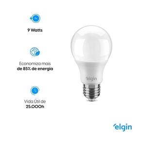 A Lâmpada LED Tipo A60 da Elgin possui potência de 9 watts e tensão bivolt (100-240V). Oferece um fluxo luminoso de 810 lumens, com eficiência de 90 lm/W.