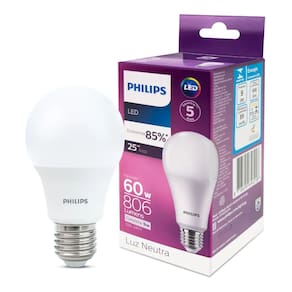 Descrição: Lâmpada Led Philips bulbo A60 bivolt base E27 Branca Neutra - 9W Garantia: 5 anos - Vida Útil (em Horas): 25000 - IRC (Índice de Reprodução de Cor): 80 - Índice de Proteção: IP20 - Fluxo Luminoso (em Lúmens): 806 - Base da Lâmpada: E27 - Temperatura de Cor (Kelvin - K): 4000 Luz Neutra