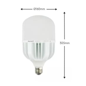 - Marca: Avant; - Referência: 789030575; - Voltagem: Bivolt; - Potência: 200W; - Soquete: E40; - Temperatura da cor: 3000K; - Cor da Luz: Amarela; - Fluxo Luminoso: 15000lm; - Eficiência Luminosa: 75lm/W; - Corpo em alumínio e difusor em policarbonato; - Não aquece o ambiente (não emite infravermelho); - Possui driver interno isolado; - Não desbota objetos (não emite ultravioleta); - Composição livre de mercúrio; - Baixo consumo de energia em relação as lâmpadas incandescentes e fluorescentes; - IRC: >80; - IP20; - Não dimerizável; - Ângulo de Abertura: 200; - Garantia: 12 meses junto ao fabricante.