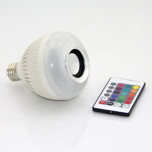 - Bluetooth: V3.0 com A2DP - alcance de até 10 metros - Controle remoto com 24 botões para controle da iluminação. - Base: E27 padrão BR - Voltagem de Entrada: AC 100-240V/50Hz-60Hz - Resposta de Frequência: 135Hz-15KHz - Potência LED: 6W 600-800LM - Potência Áudio: 3W - Cor LED: Branco + RGB Colorido - Dimensões: 15,0cm ALTURA x 8,5cm LARGURA - Distancia do Controle Remoto: 10 metros Ean: 7909389656897